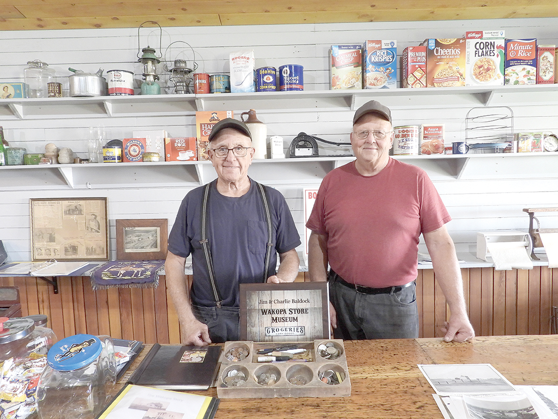 PHOTO CAPTION: Brothers Charlie and Jim Baldock show the “cash register” in front of them in their “Wakopa Store Museum” located in Lena, Manitoba. PHOTO BY SUZANNE PADDOCK
