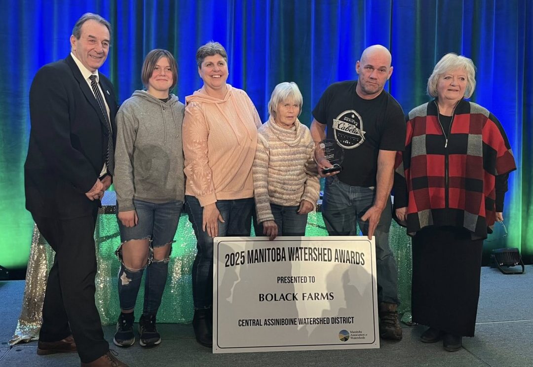 PHOTO CAPTION: Bolack Farms from Glenora received the 2025 Manitoba Watershed Award to recognize the efforts they have made on their operation to the benefit of the land. Pictured l. to r.: Minister of Agriculture, Ron Kostyshyn, Breanne Bolack, Jen Bolack, Claudia Bolack, Rodney Bolack and Shannon Pyziak, MAW Chair. PHOTO SUBMITTED