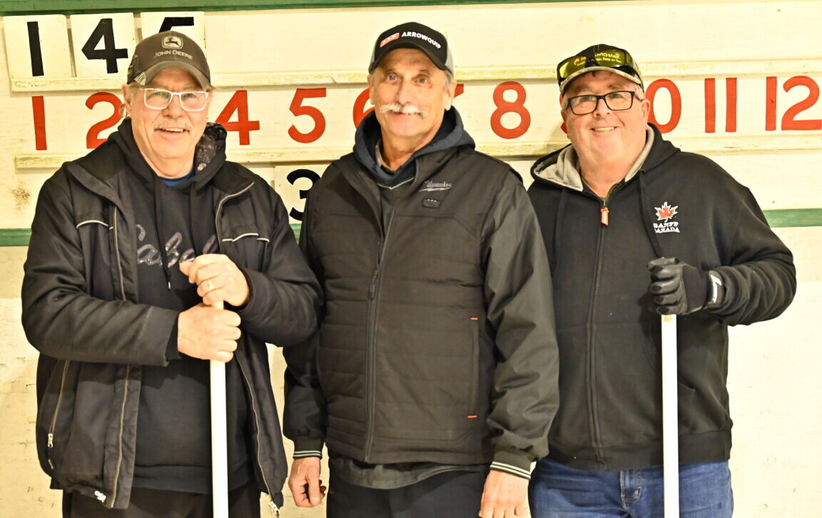 PHOTO CAPTION: Taking first place in the Glenora 3-person Funspiel was the rink of (l. to r.) Bill Odell, Doug Wilson and Mark Lebeau over Shawn Van Damme, Jackson Van Damme and Desmond Lebeau. PHOTO BY SUZANNE PADDOCK