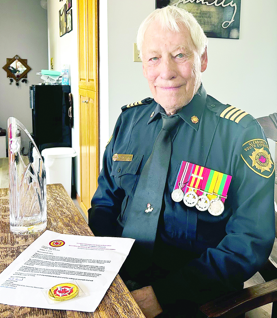 PHOTO CAPTION: Garth McIntyre of Glenboro recently received a one-of-a-kind coin from the Canadian Volunteer Fire Services Association to commemorate his 2023 Lifetime Achievement Award.